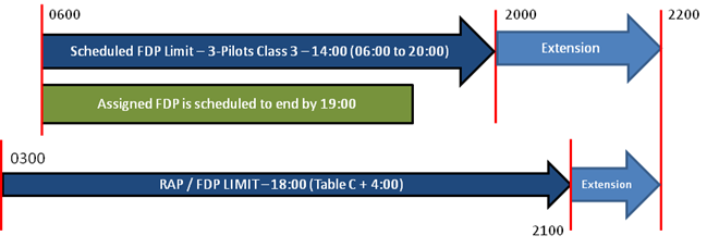 In this example, the crewmember is strictly limited by the Primary Rule, and no further extension beyond 22:00 will be permitted if the condition is known before takeoff. As you can see the FDP is extended beyond the combined RAP and FDP limit of 21:00.